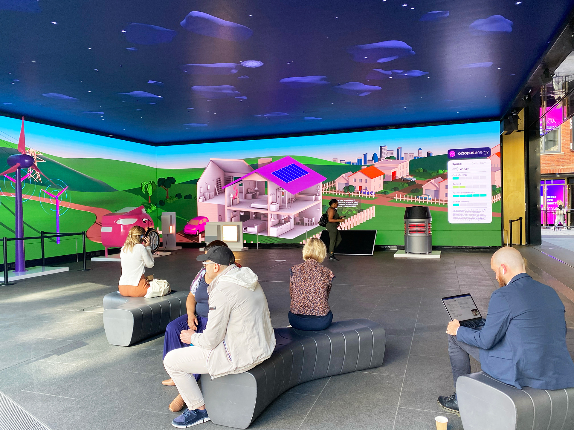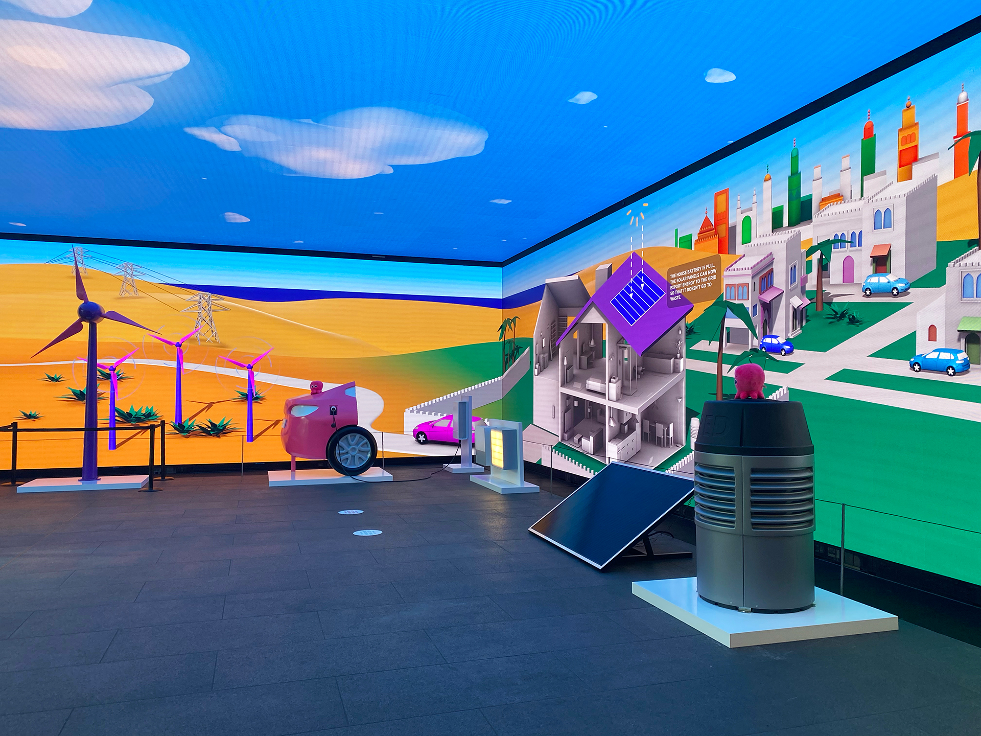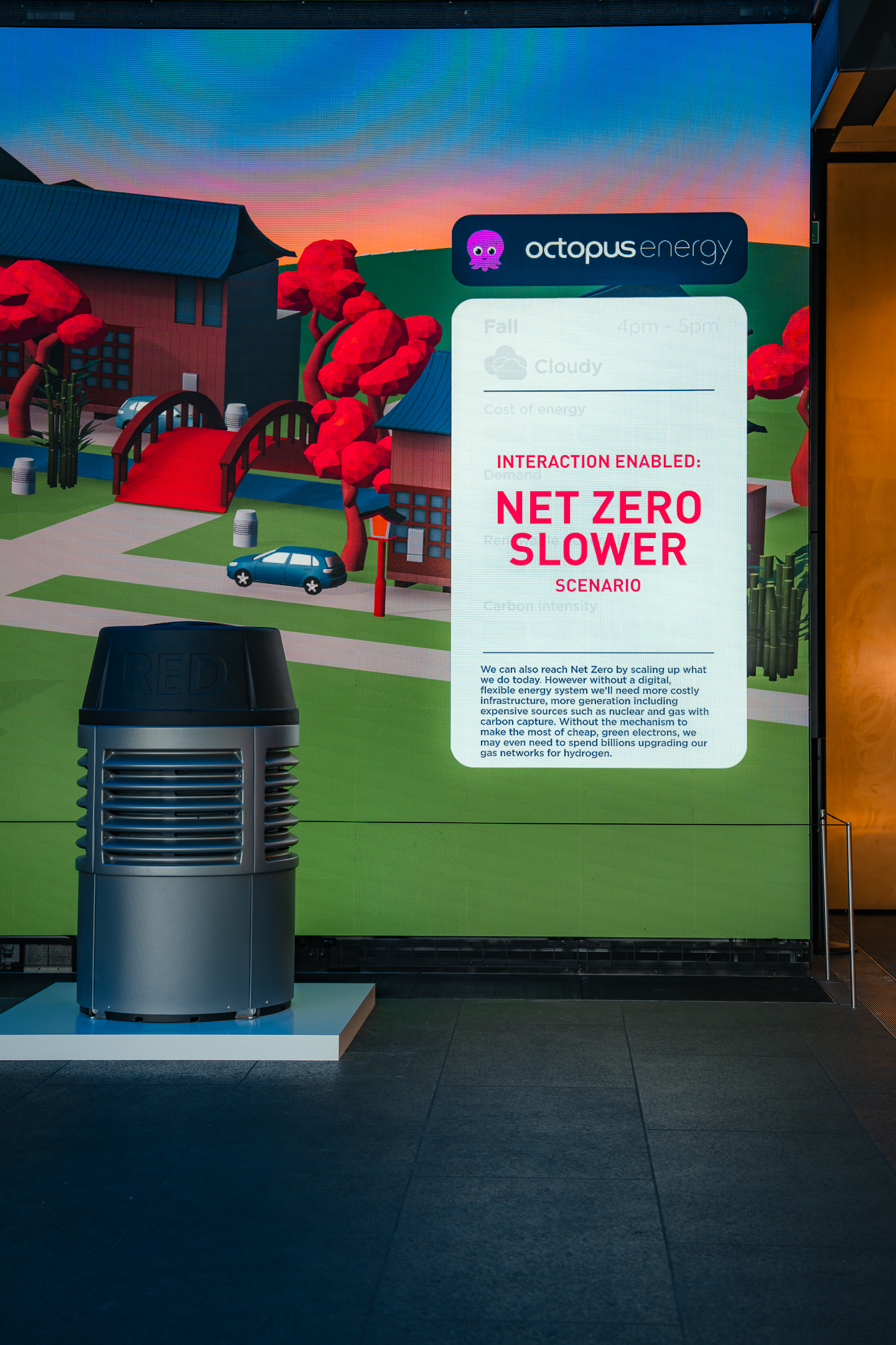 The installation also encourages visitor participation by presenting two scenarios through floor stickers: one for achieving carbon neutrality quickly and another for doing so slowly. When triggered, a rippling effect appears across the screen temporarily ‘freezing’ the standard narrative to begin explaining how the adaptation of smart device control, or lack of, will impact a neighbourhood’s energy consumption, the infrastructure in its environment, and an individual’s energy bills over time.