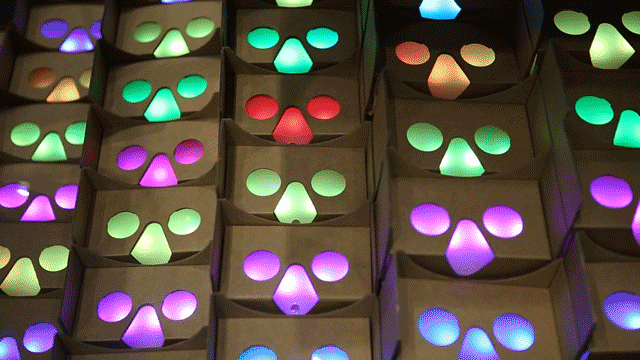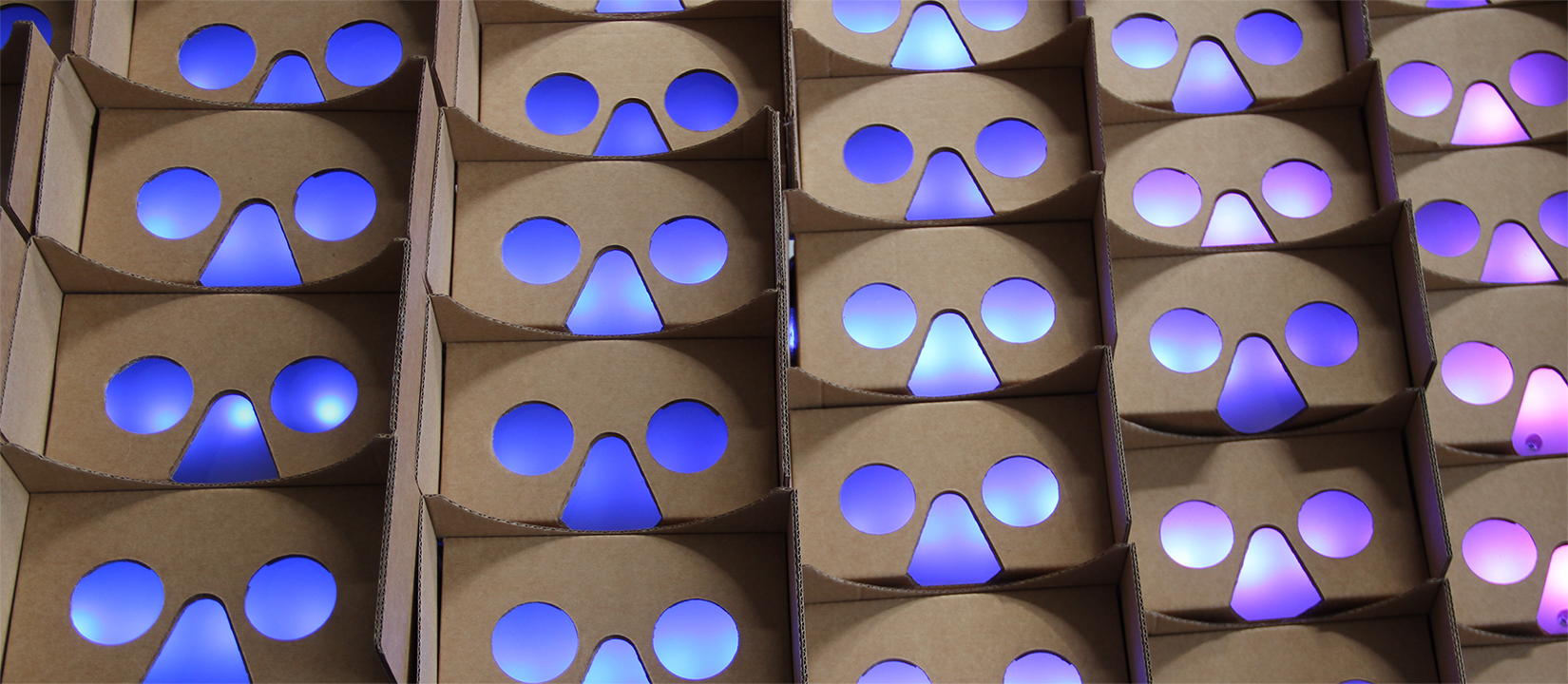 The headset is a cheap, easily mass produced way of giving people access to virtual reality, unlike most companies whose headsets are hundreds of times more expensive. Its not often products from big companies are made from card so we wanted to use the material as much as we could in the installation. We created a large cardboard wave, strewn with LED tape, creating a dynamic 3D screen.