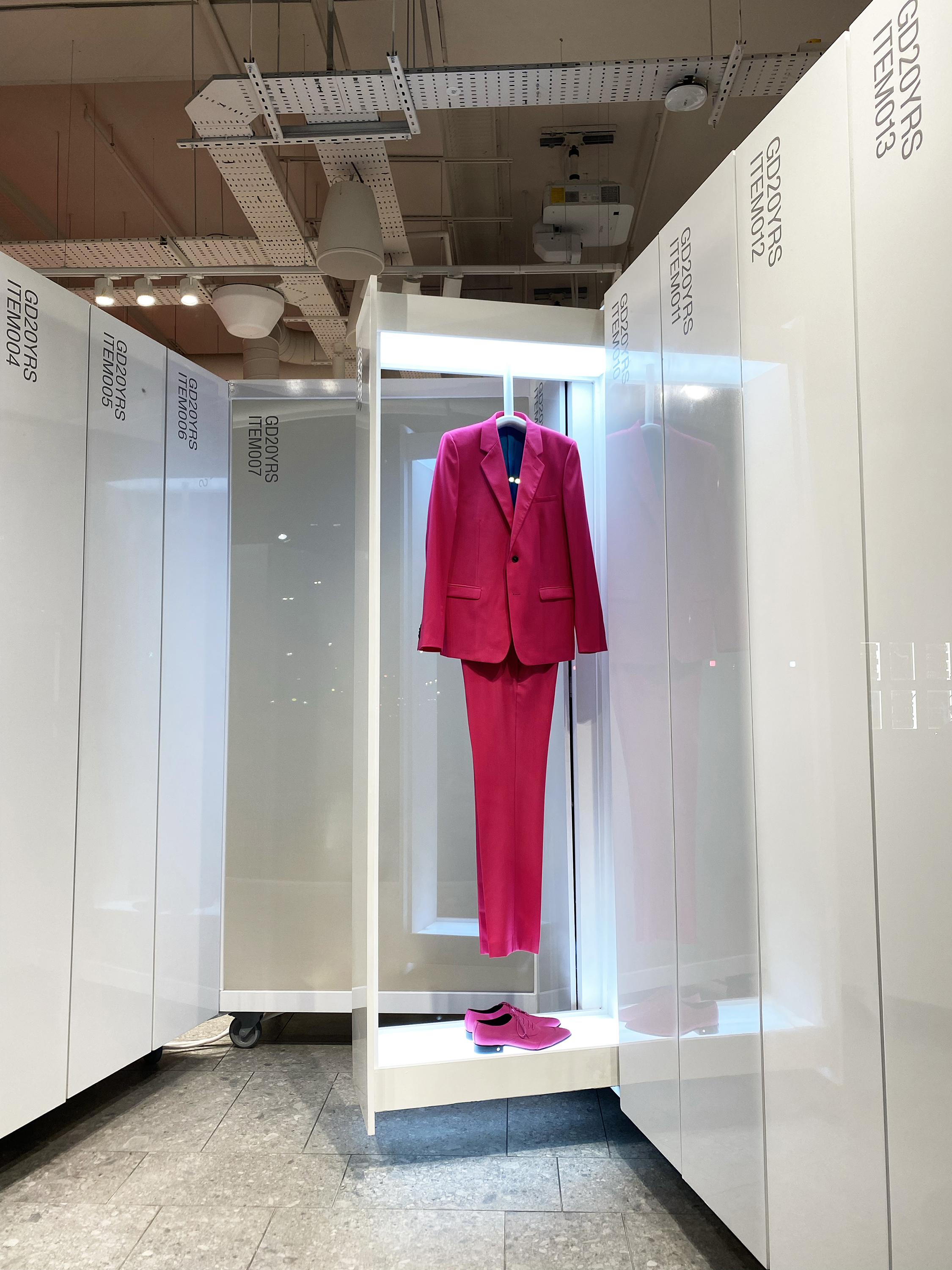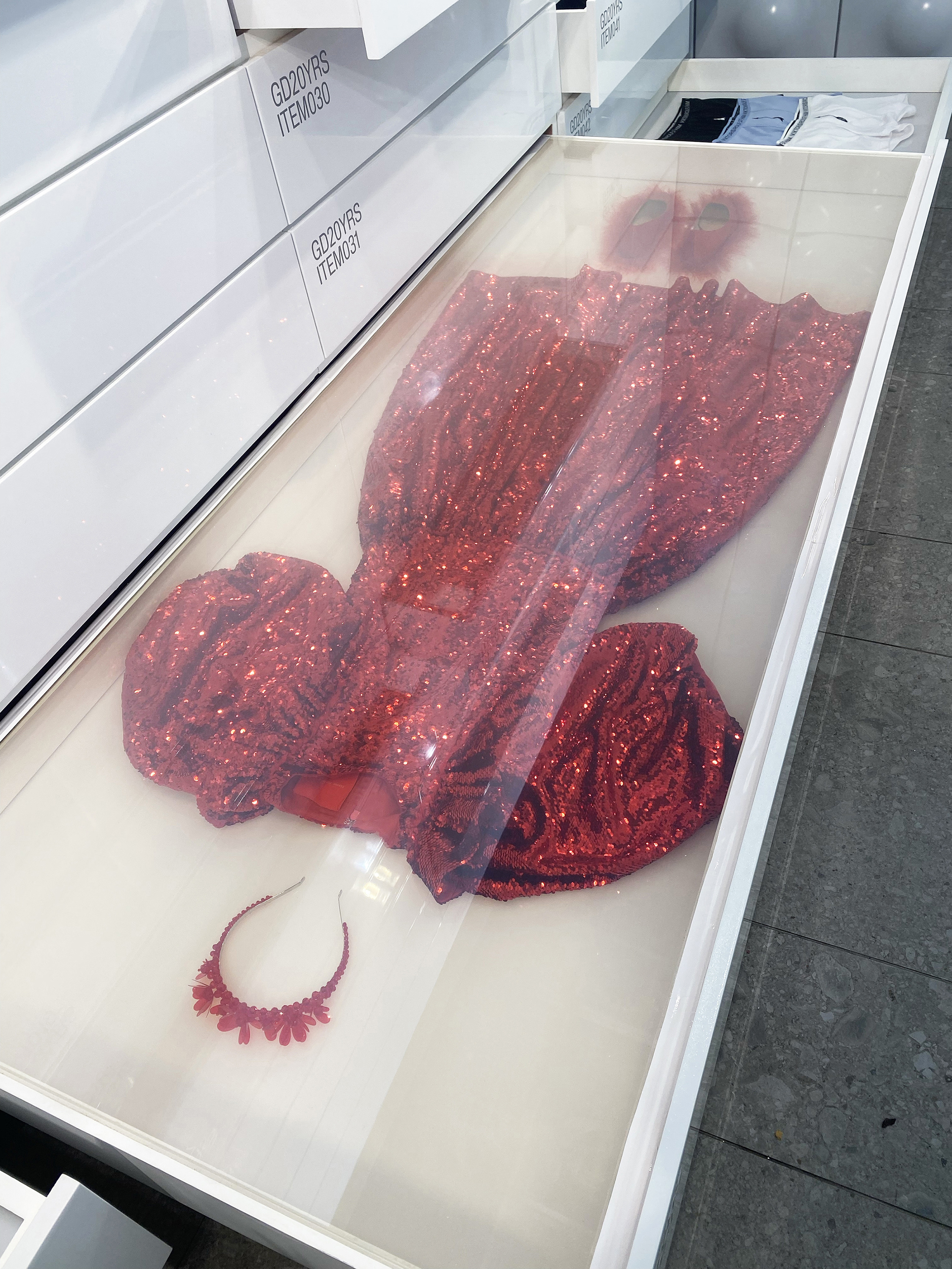 On the right-hand side window, we created a set of vertical wardrobes presenting a full look from head to toe. The center of the set up revealed a surprise element behind a large-sheet of smart film: when it turned off, a lavish wedding gown would be revealed.