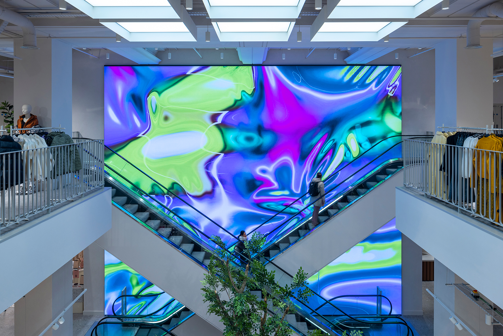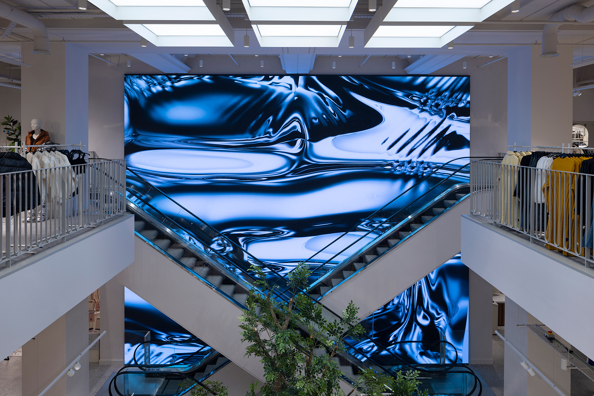 The constantly evolving, generative artwork interacts with customers as they travel on the escalators between the ground and first floors. It evolves and changes in line with the time of day, seasonal campaigns and can now be updated in line with upcoming collections.