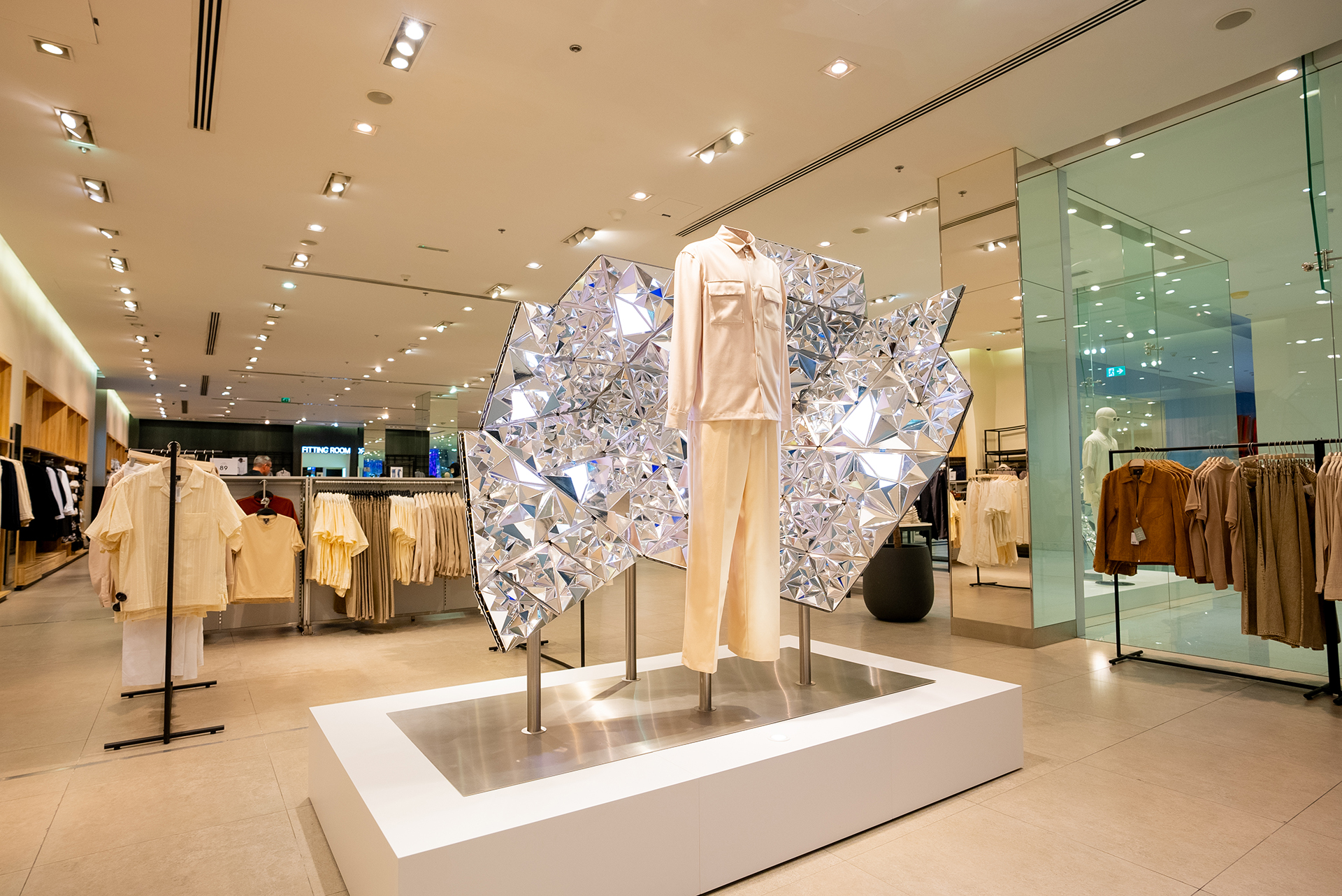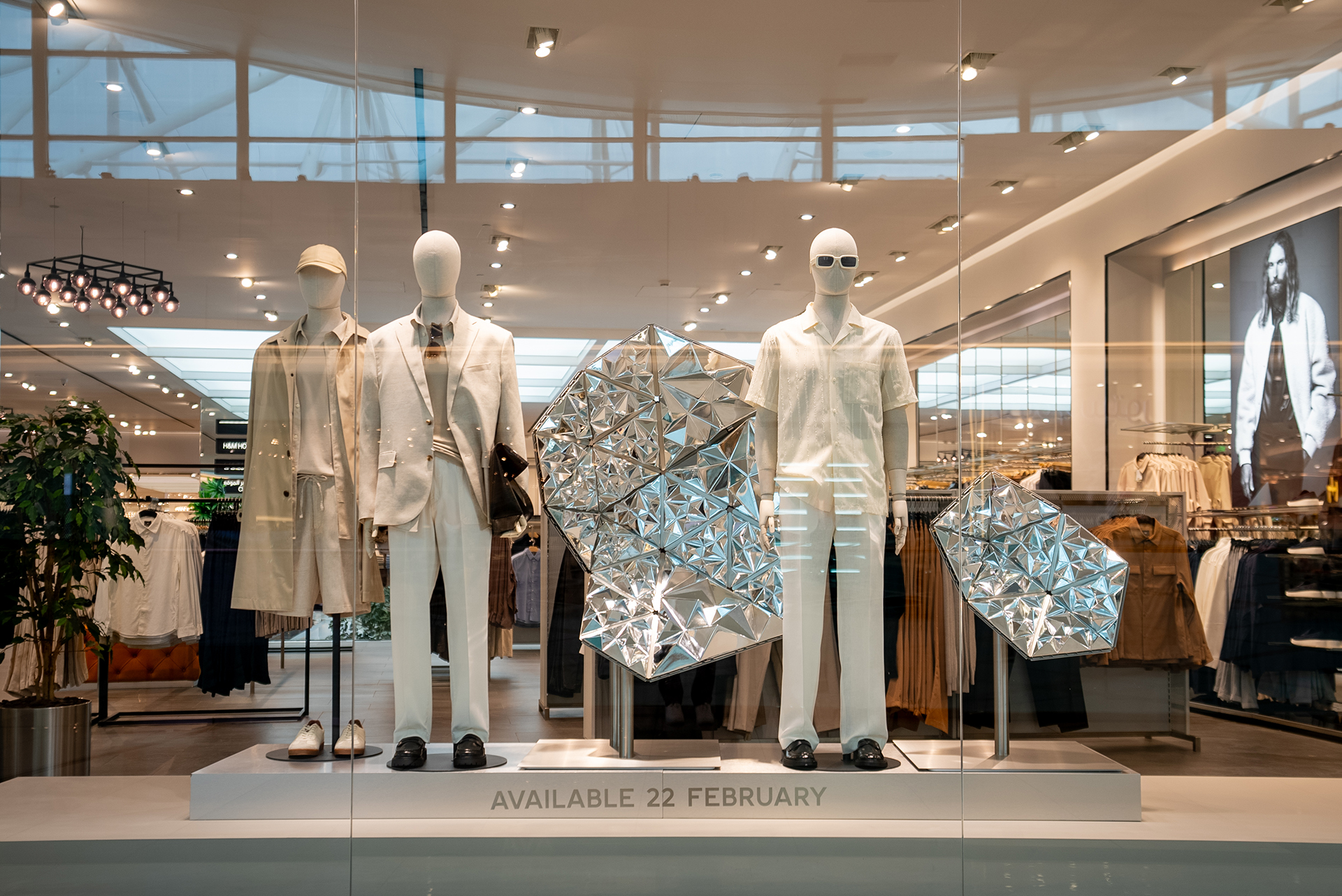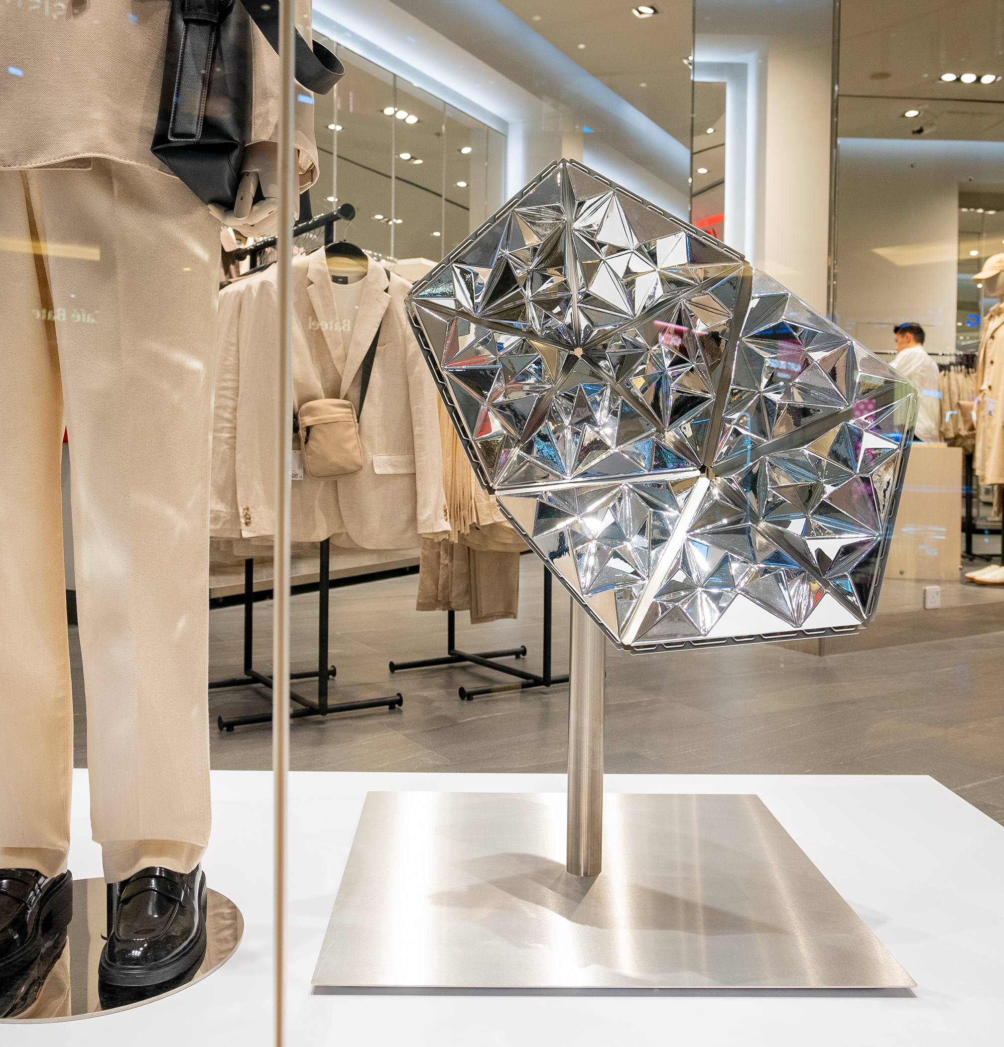 With modularity and sustainability at its core, Mutable Futures was designed to be reused, and travel across H&M stores. They are made up from hundreds of vacuum-metallised reflective shards, and constructed with precision using laser-cut aluminium. The larger modules of the sculptures also feature programmable LED panels which can be easily updated in line with the colours of the latest collection, to compliment the garments on display.
