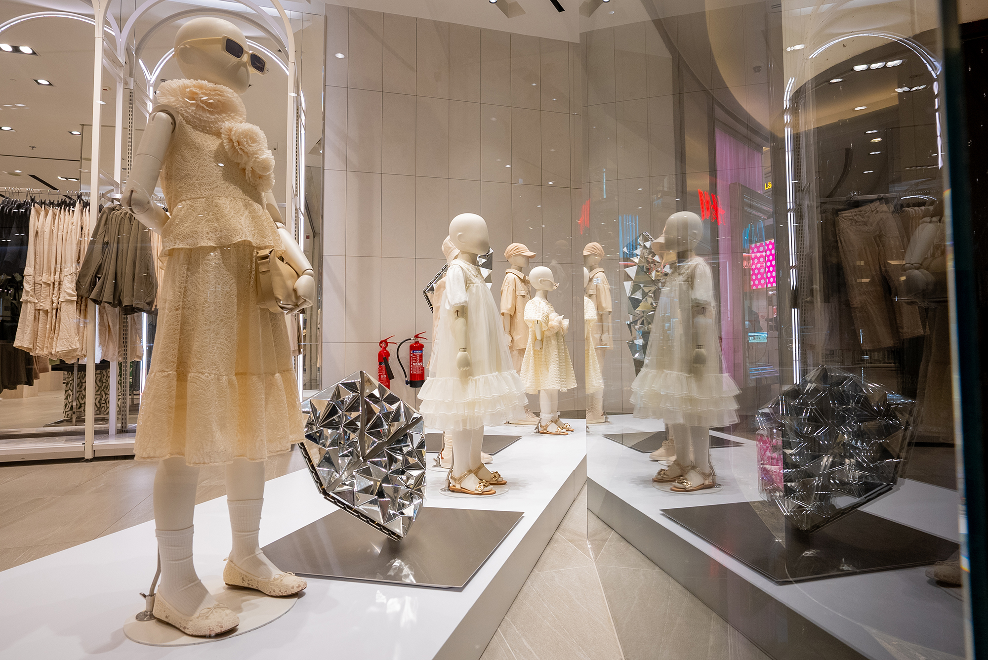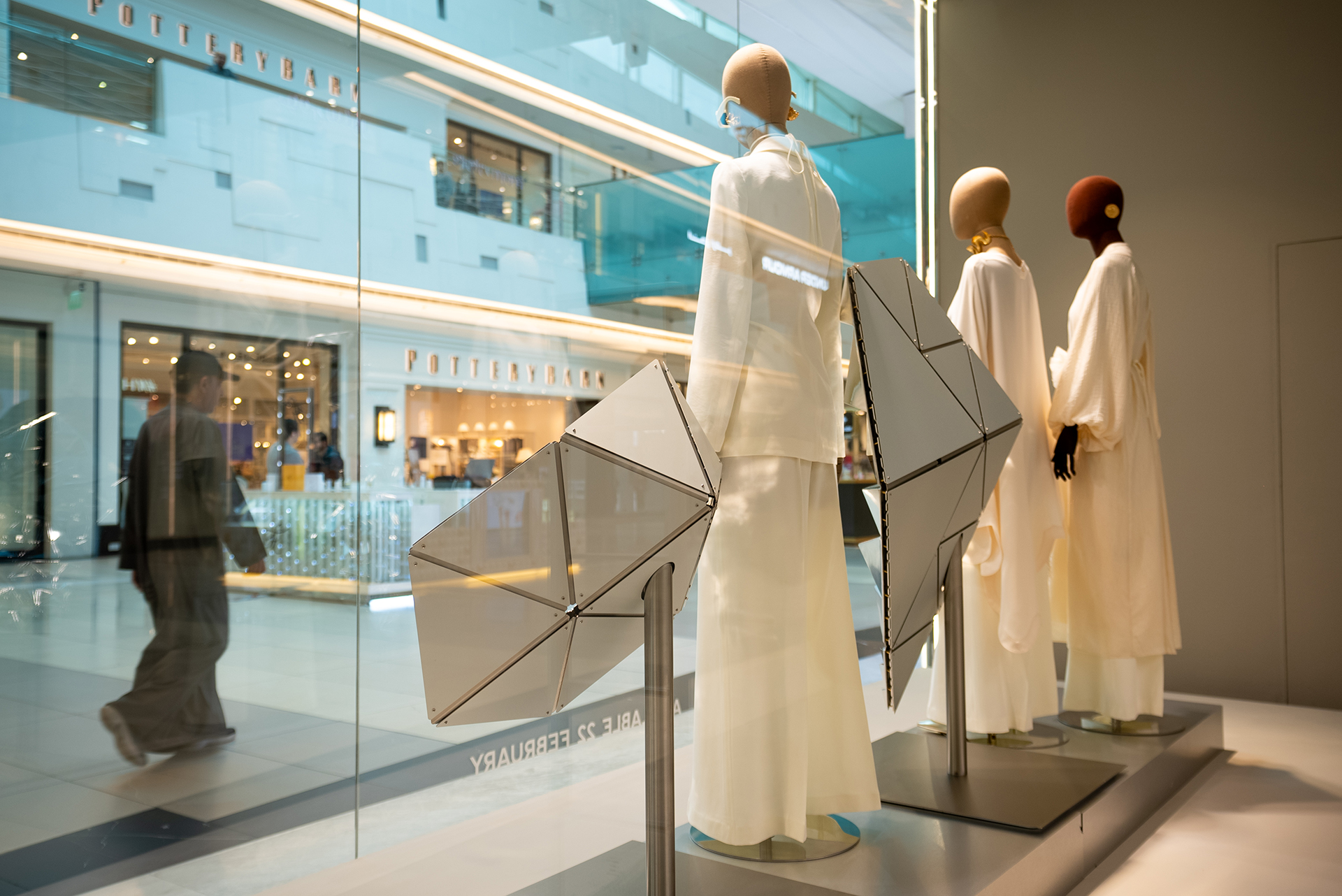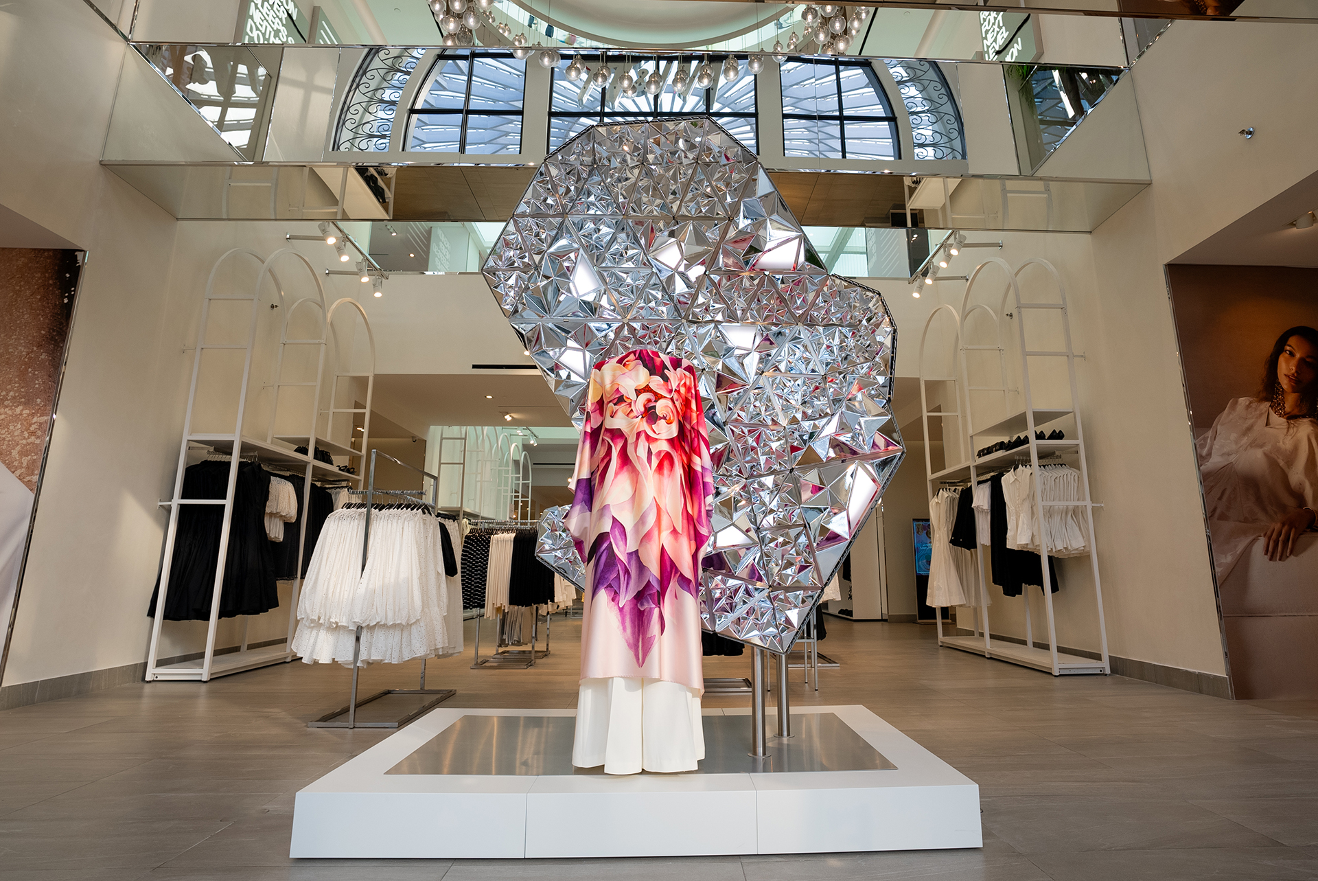 With modularity and sustainability at its core, Mutable Futures was designed to be reused, and travel across H&M stores. They are made up from hundreds of vacuum-metallised reflective shards, and constructed with precision using laser-cut aluminium. The larger modules of the sculptures also feature programmable LED panels which can be easily updated in line with the colours of the latest collection, to compliment the garments on display.