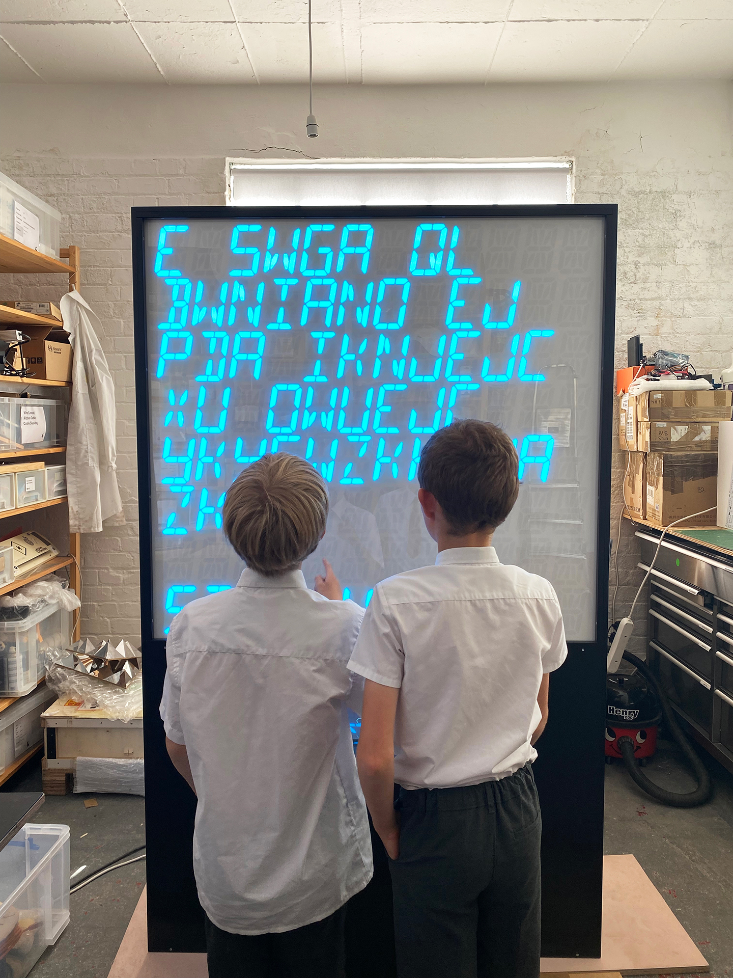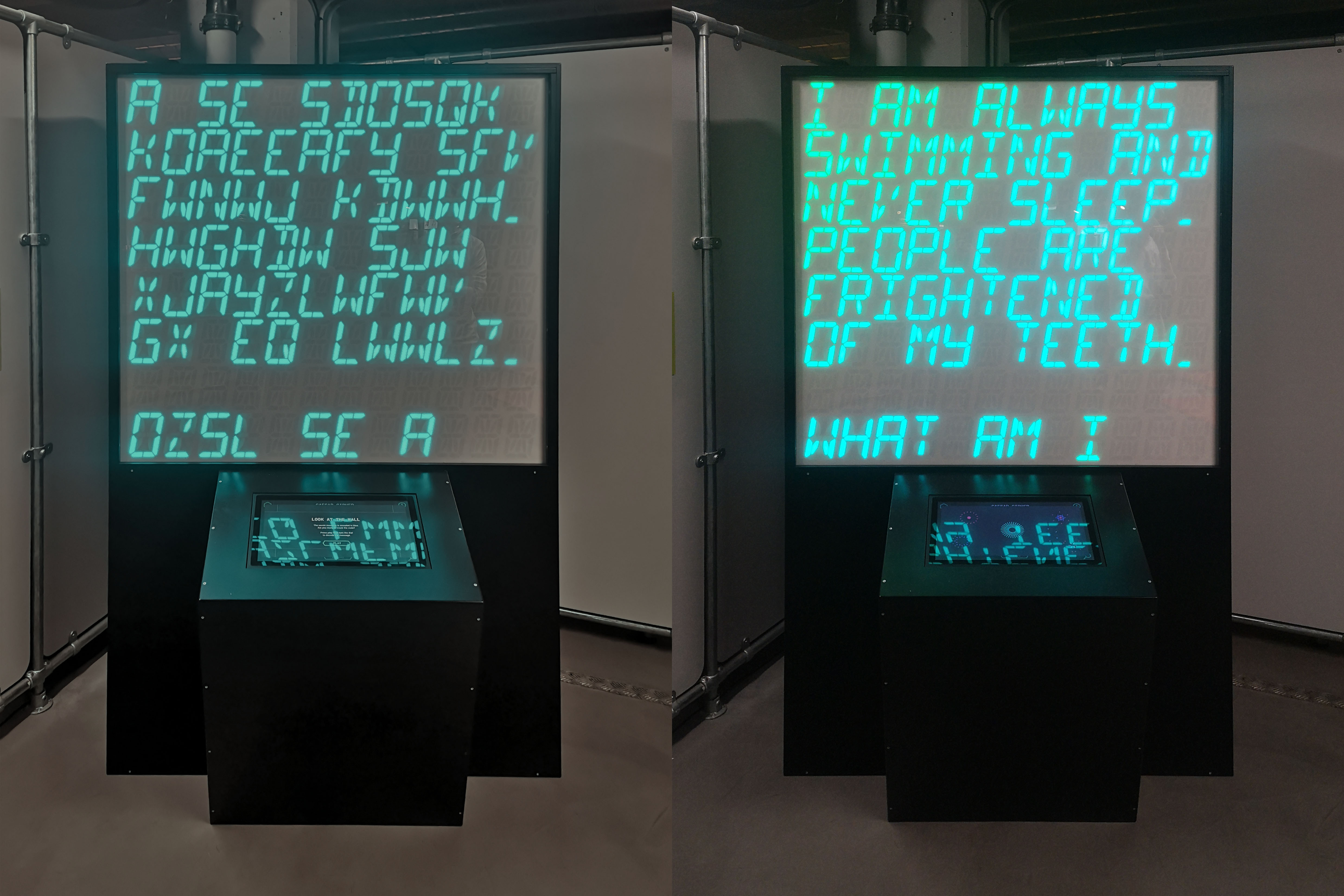 As an evergreen installation, the totem was designed to be adaptable: It can display letters and numbers and is controlled via a touchscreen interface, allowing the riddles to change over time and different types of ciphers to be showcased.