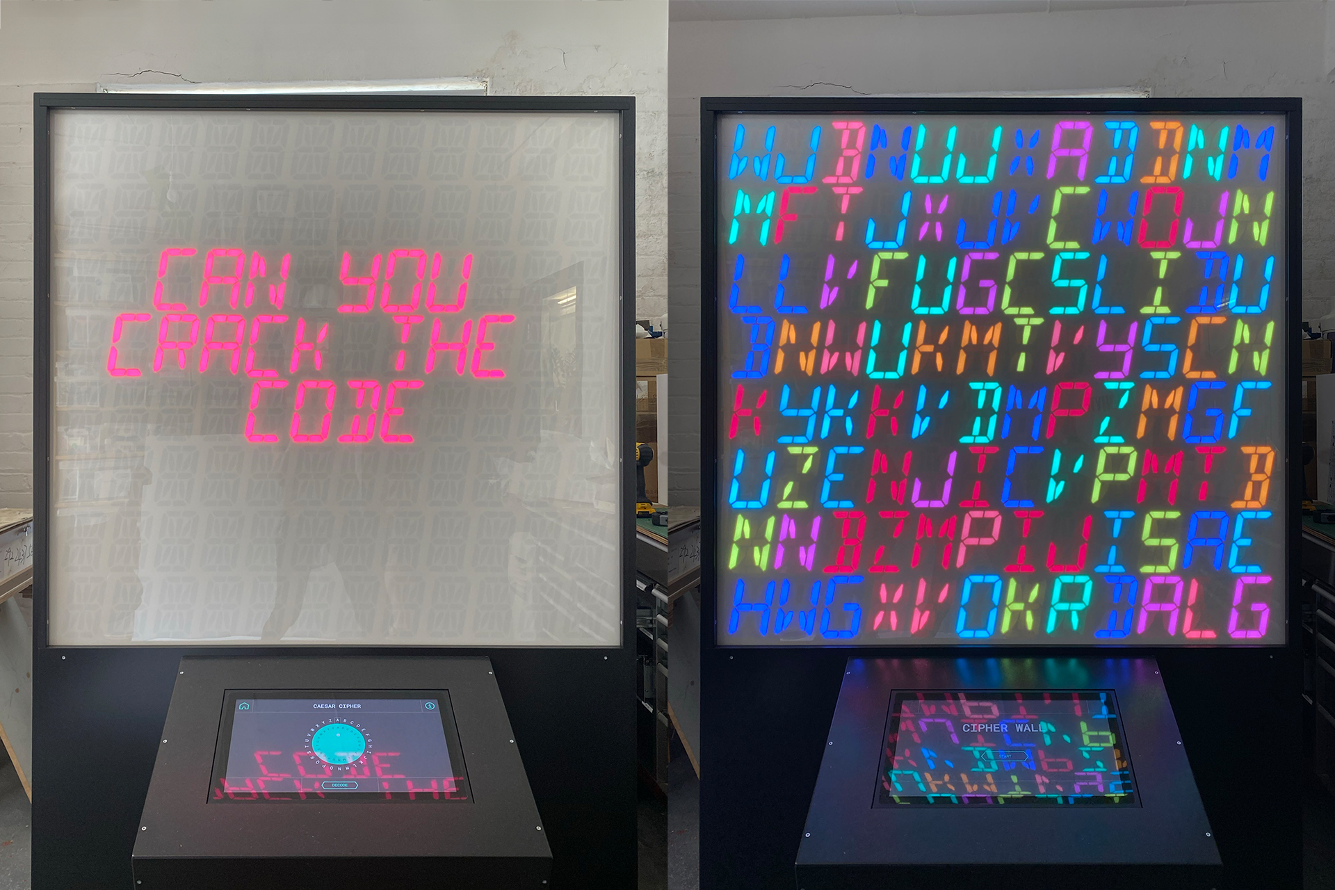 The aim of the installation was to portray an aspect of mathematics in a fun and engaging way whilst supporting efforts to attract new and returning visitors into the space. Focusing on the theme of code breaking, we designed a large-scale digital totem with a grid of ever-changing letters, inviting visitors to decode predefined secret messages through a 3-level game: The Caesar Cipher, the Multiplicative ‘X’ Cipher, and a Combination of both!
