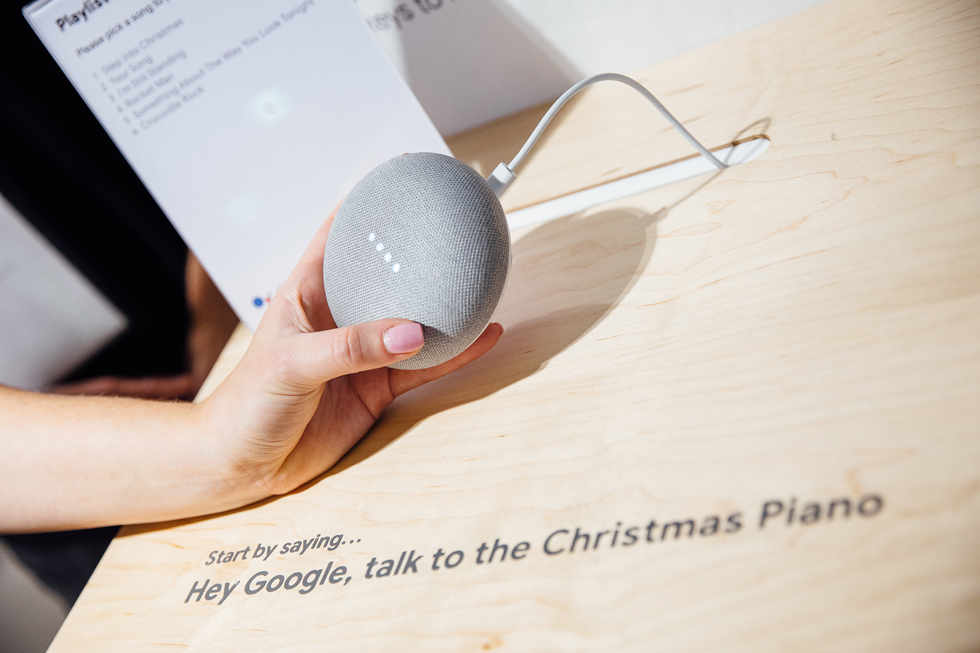 The customer is invited to speak to the Google Assistant to enable the piano. They can either say “Teach me how to play a song”, or ask it to “Play this song for me”. Having a play and surely attracting a small audience, they have the choice to get a printed photo of themselves on the piano in a nice Christmas card envelope, to send to friends or family.